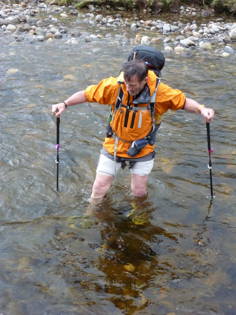 There is a school of thought that unlined trail shoes are fine; lightweight and much to be preferred. The water goes in when you splash through streams and wet ground, but is pumped out as you walk and your socks soon dry as you walk on drier ground. Certainly on the eastern side of the Highlands I’ll accept this, and maybe sometimes in the west. However, 2014 saw a lot of rain. The weather was warmer than usual, and rain and snowmelt combined to make underfoot conditions unusually wet. I couldn’t see anyone’s shoes drying out in the first three days unless they were sticking with tracks and roads. A case for waterproof socks and liners? I can’t comment as I wouldn’t have worn trail shoes in those conditions – I might have worn boots to begin and had a pair of shoes posted to say Ft Augustus and swapped there. There’s an idea for the future, maybe.